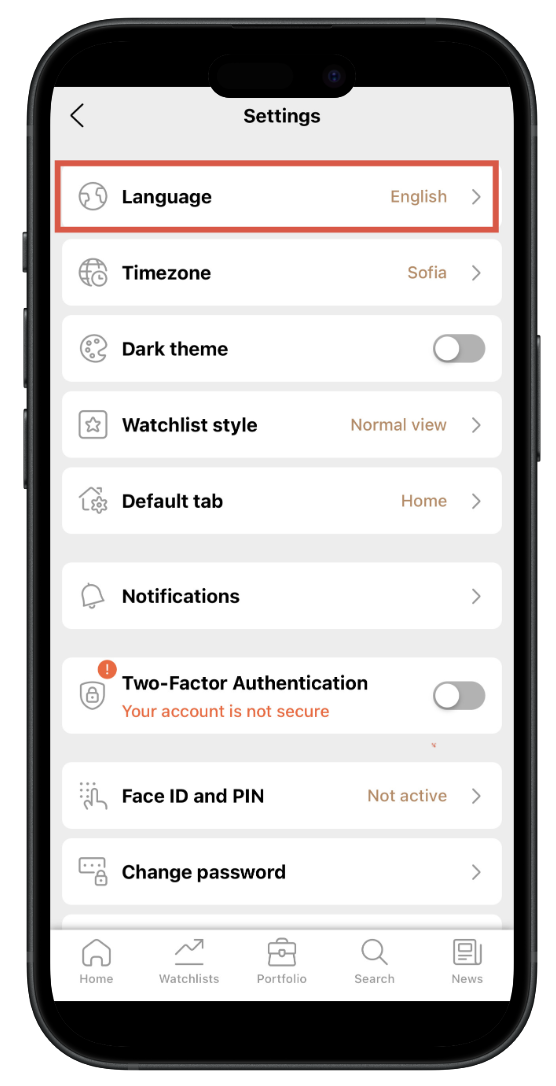 على التطبيق المحمول، ببساطة اضغط على الحساب (في الزاوية العليا اليسرى)، انتقل إلى الإعدادات، ثم اللغة (الخيار الأول). اضغط على اللغة التي تريد التبديل إليها، ثم اضغط على زر العودة لحفظ التغييرات.