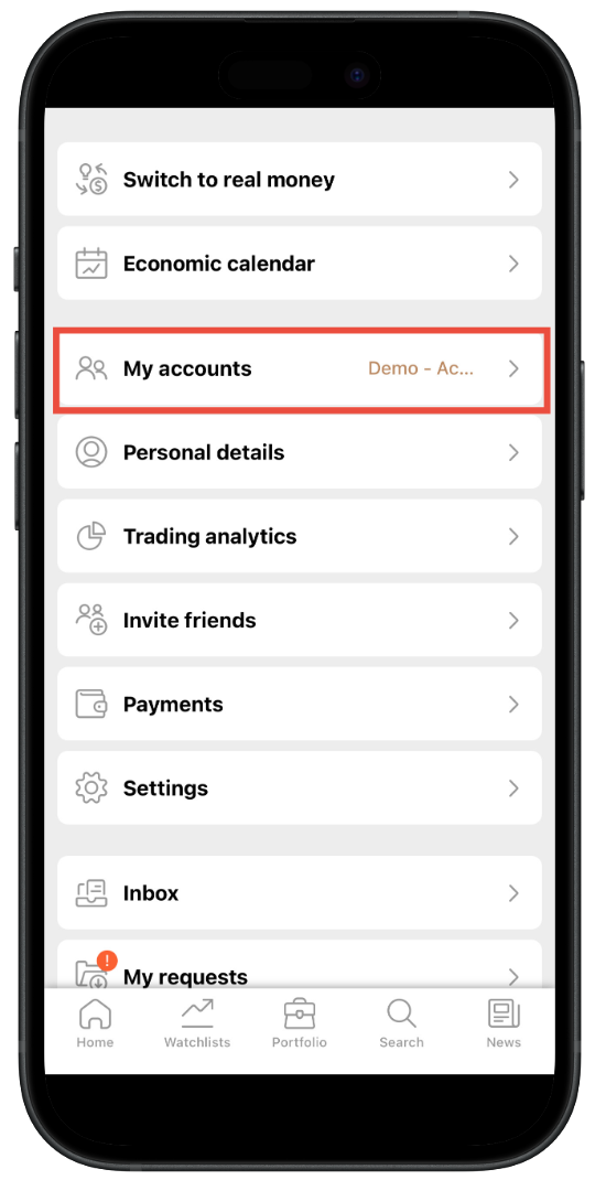اختر حساب العرض التجريبي الذي تريد تعديله، ثم اضغط على "تعديل الرصيد".